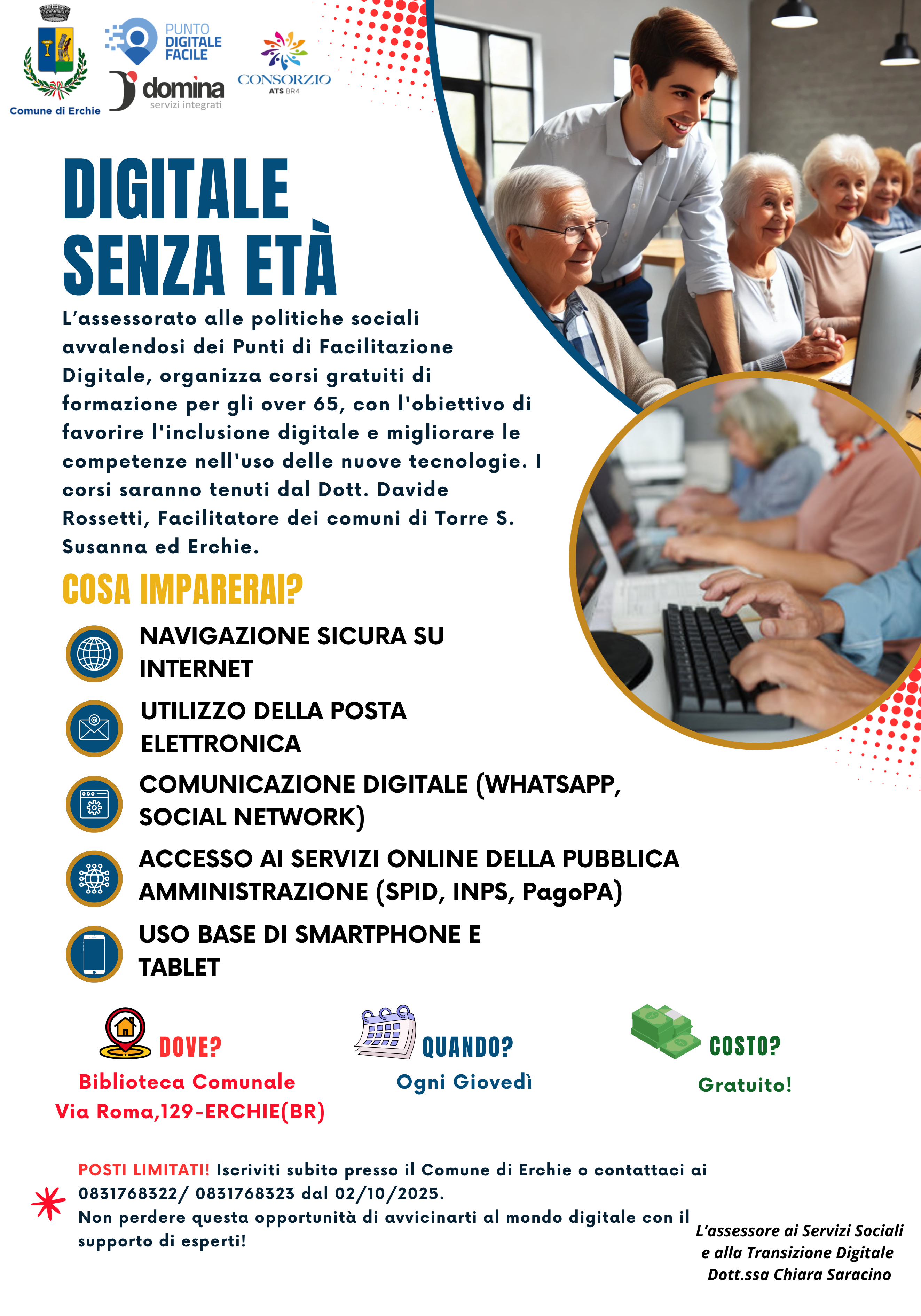 I corsi si terranno presso i locali della biblioteca comunale "Morvillo-Falcone" il giovedì a cura del Dott. Davide Rossetti, facilitatore digitale del Comune di Erchie.